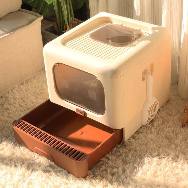 设计逻辑:针对室内养宠的异味散发和猫砂飞溅问题,采用全封闭结构设计,通过物理隔离方式阻断气味传播路径,同时防止猫咪刨砂时颗粒外溅。