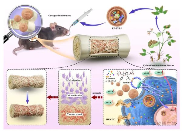既往许多研究集中于药物对骨细胞的直接作用,而2025年发表于《Phytomedicine》的研究提示,淫羊藿外泌体的作用路径有所不同,作用机制是从“血管”入手改善“骨骼”。