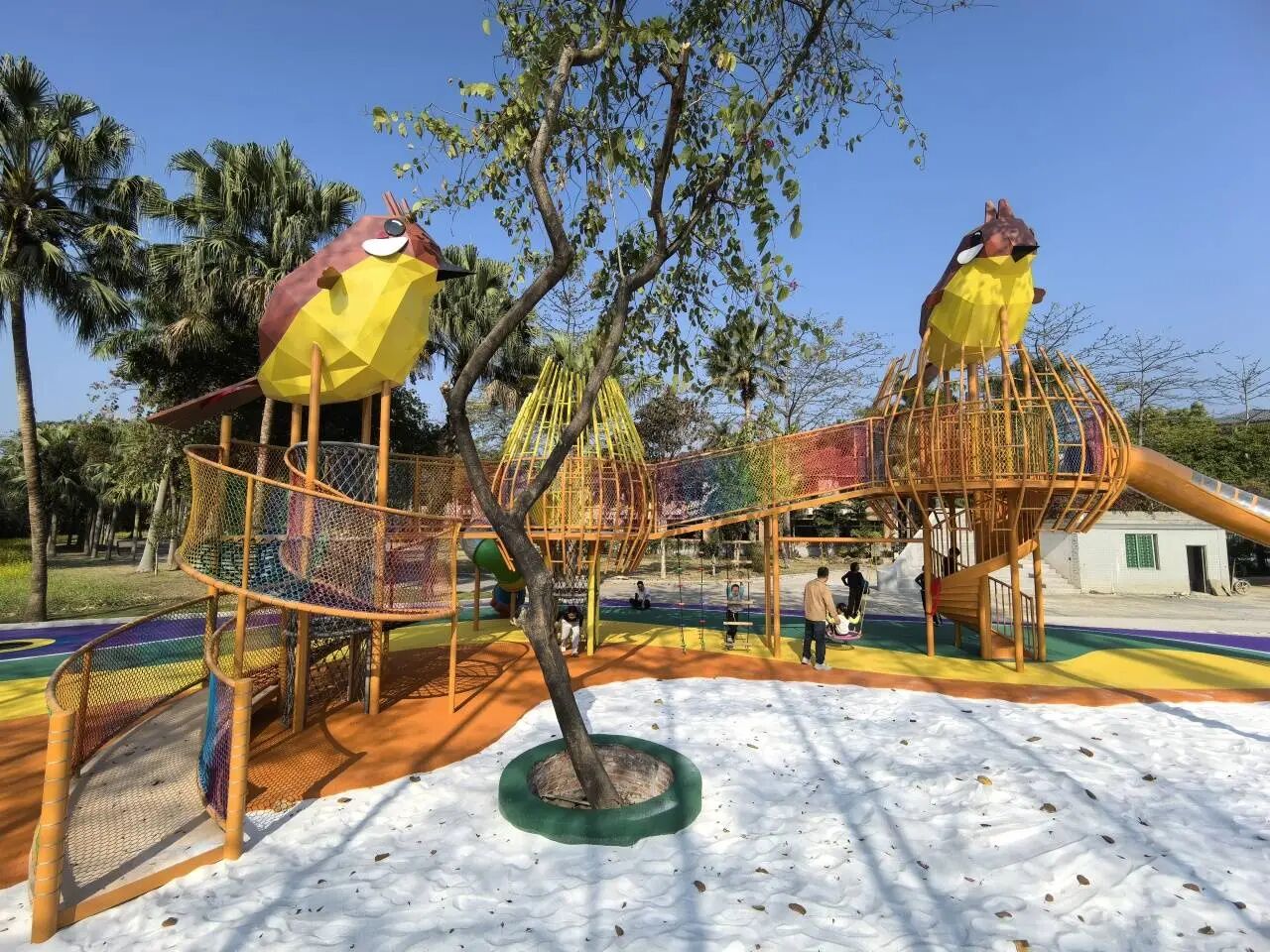 在无动力乐园产品线上,广州中力游乐集团提出"地域文化共生"的设计理念,根植于地域文化打造连接儿童与自然的沉浸式游乐空间。这一理念在韶关遥田镇儿童公园项目中得到充分体现。项目结合当地"鹅鸭之乡"的地方特色进行定制化设计,利用闲置空地打造地标性口袋公园,助力国家儿童友好城市建设。