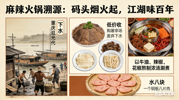 麻辣火锅的历史,是一部底层劳动者的生存智慧史。其雏形可追溯至清朝道光年间的重庆嘉陵江畔、朝天门等码头重庆市地方志办公室。彼时,作为长江上游航运枢纽,大批船工、纤夫与码头苦力常年劳作于潮湿环境,他们低价收购屠宰场废弃的牛毛肚、黄喉、鸭肠等 “下水”,以牛油、辣椒、花椒熬制浓汤涮煮,既能驱寒祛湿、掩盖腥味,又能以低成本补充高热量蛋白。这种被称作 “水八块” 的吃法,以一个铜板八片肉的亲民定价,在码头劳工间迅速流传,成为麻辣火锅最早的形态重庆市地方志办公室。
